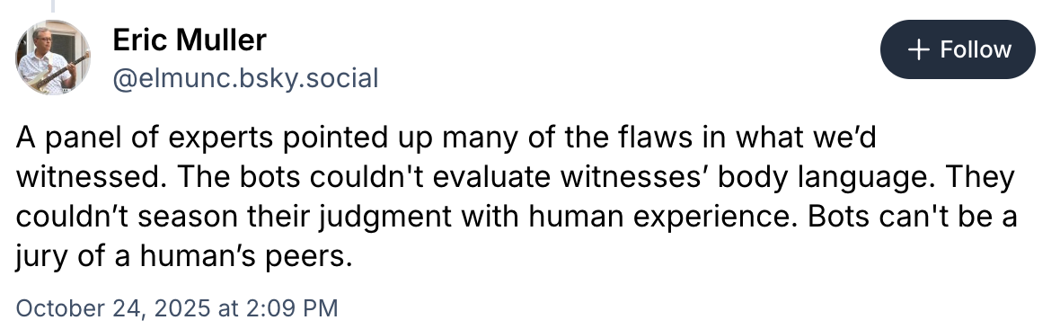 The thing with AI — aside from its inherently rickety funding model — is that (a) it’s very good at the tasks it’s good at, and (b) almost everyone pretends it’s good at the tasks it’s not good at. Can AI replace human jurors? No. No matter how bad human jurors are, a sycophantic calculator playing “word roulette” is not better.
