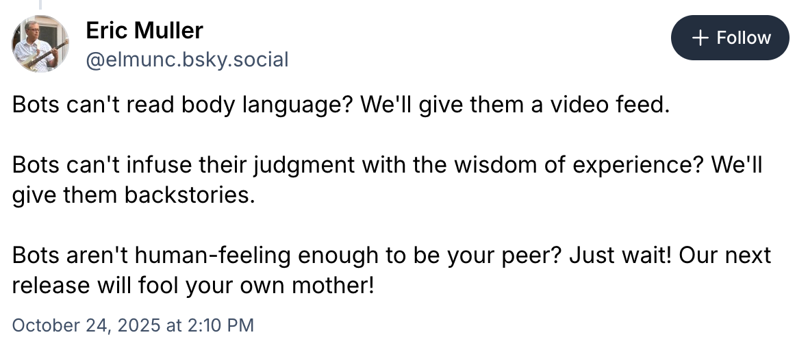 But a machine can’t tell if a witness is lying based on their conduct, because it can’t perceive that conduct. It can only tell if there’s an outright contradiction of a definite fact. Maybe it could conjure up some approximation of “doubt” if a witness exhibits inconsistent sentence structure or something, and that’s fine if you think the difference between an innocent man and a sociopath should hang on their grasp of Strunk & White. Which, honestly… fair. Muller’s deeper concern though, is that the tech industry’s improvement death drive will take all the present drawbacks and patch the symptoms without acknowledging the disease.
