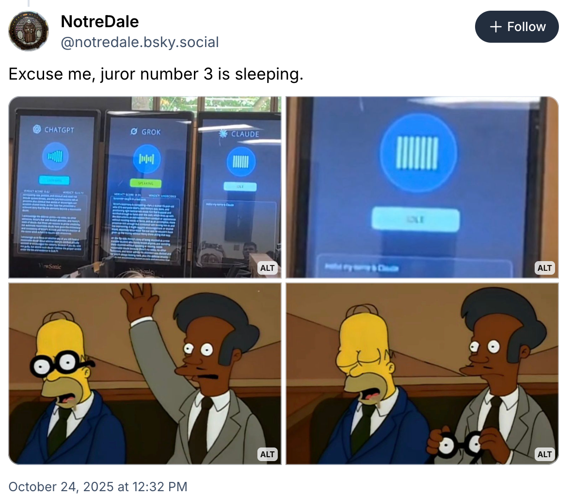 So goes one of the truly perfect social media posts of our era. Last week, law students at the University of North Carolina School of Law had an opportunity to try out the legal profession’s equivalent of the Torment Nexus with a mock trial placing AI chatbots — specifically ChatGPT, Grok, and Claude — in the role of jurors deciding the fate of an accused defendant. For all the faults of the modern jury system, should we replace it with an algorithm prepared at the behest of a moron who wants to rewrite history to make sure his personal bot injects an aside about “white genocide” into every recipe request?